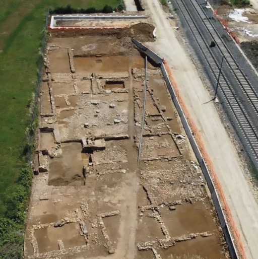 Gli scavi eseguiti hanno appurato che l’intero palinsesto strutturale, costituito da murature e fondazioni in ciottoli, venne realizzato in corrispondenza di un’area palustre appositamente bonificata ai fini dell’edificazione avente una destinazione quasi certamente a carattere produttivo e commerciale così come attestato anche dalla presenza di una iscrizione in lingua